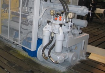 Применен двухступенчатый, пластинчатый насос DENISON, см. фото выше. Механическое присоединение электродвигателя к насосу выполнено через резиновые, эластичные муфты, что снижает вибрацию и шум при работе.